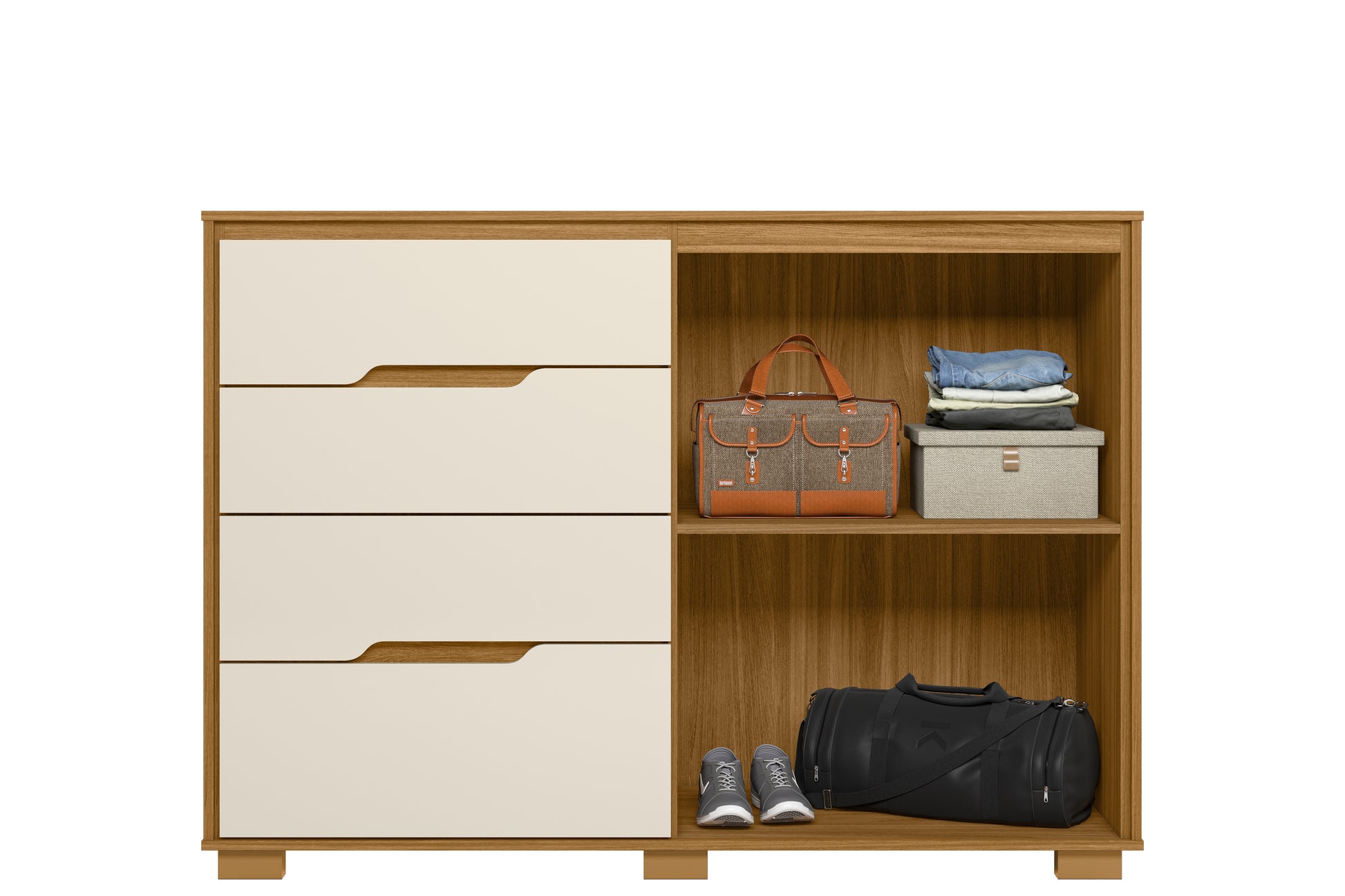 Cómoda Texas color Café con blanco crema ,2 puertas detalles listones ,4 cajones rieles telescopico,1 Repisas, Bisagras metálicas cierre suave, 6 Patas, complemento perfecto para tu habitación.