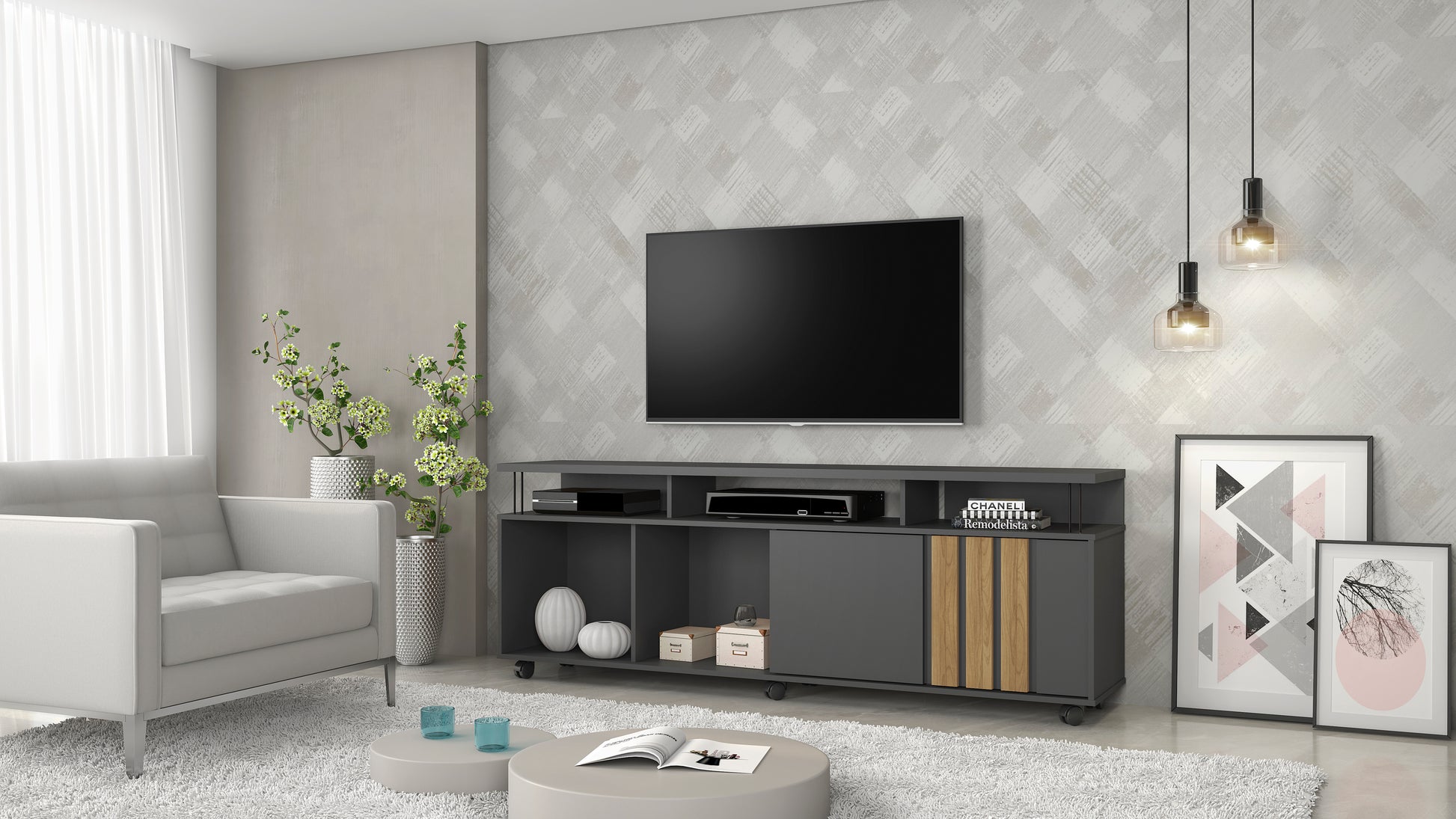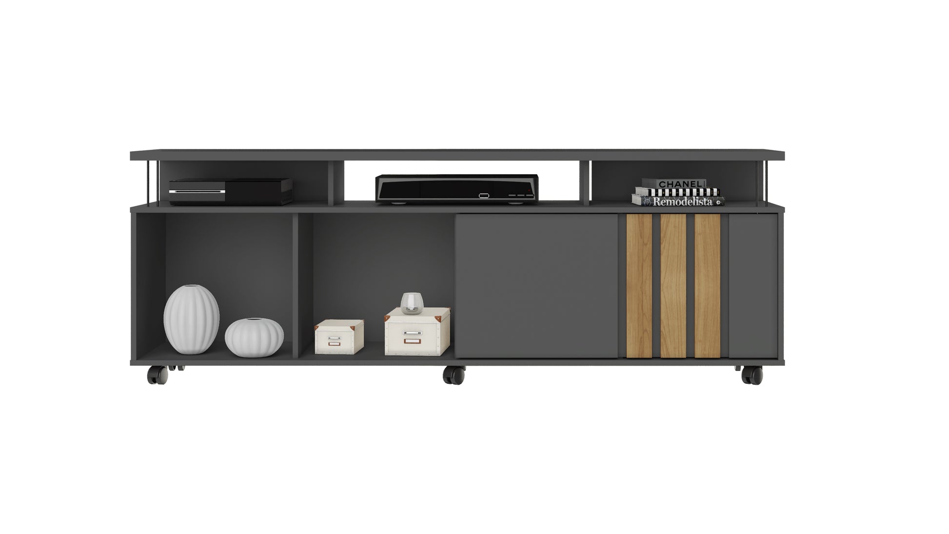 Rack para TV de 70 pulgadas, Puerta corredera con detalle de listones, Ruedas, Decoraciones y soporte con tubos de metal, espacio para TV: 175 cm