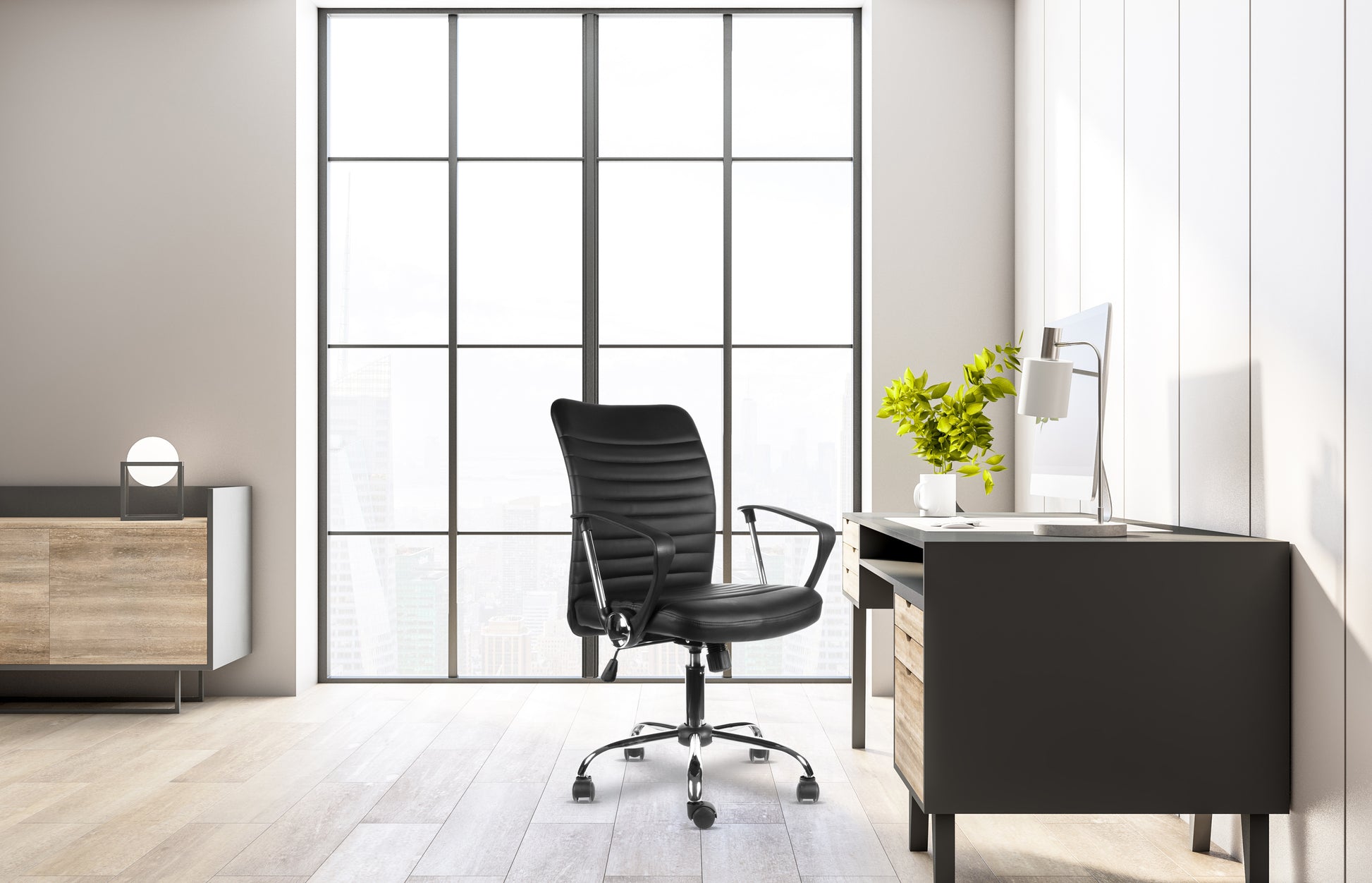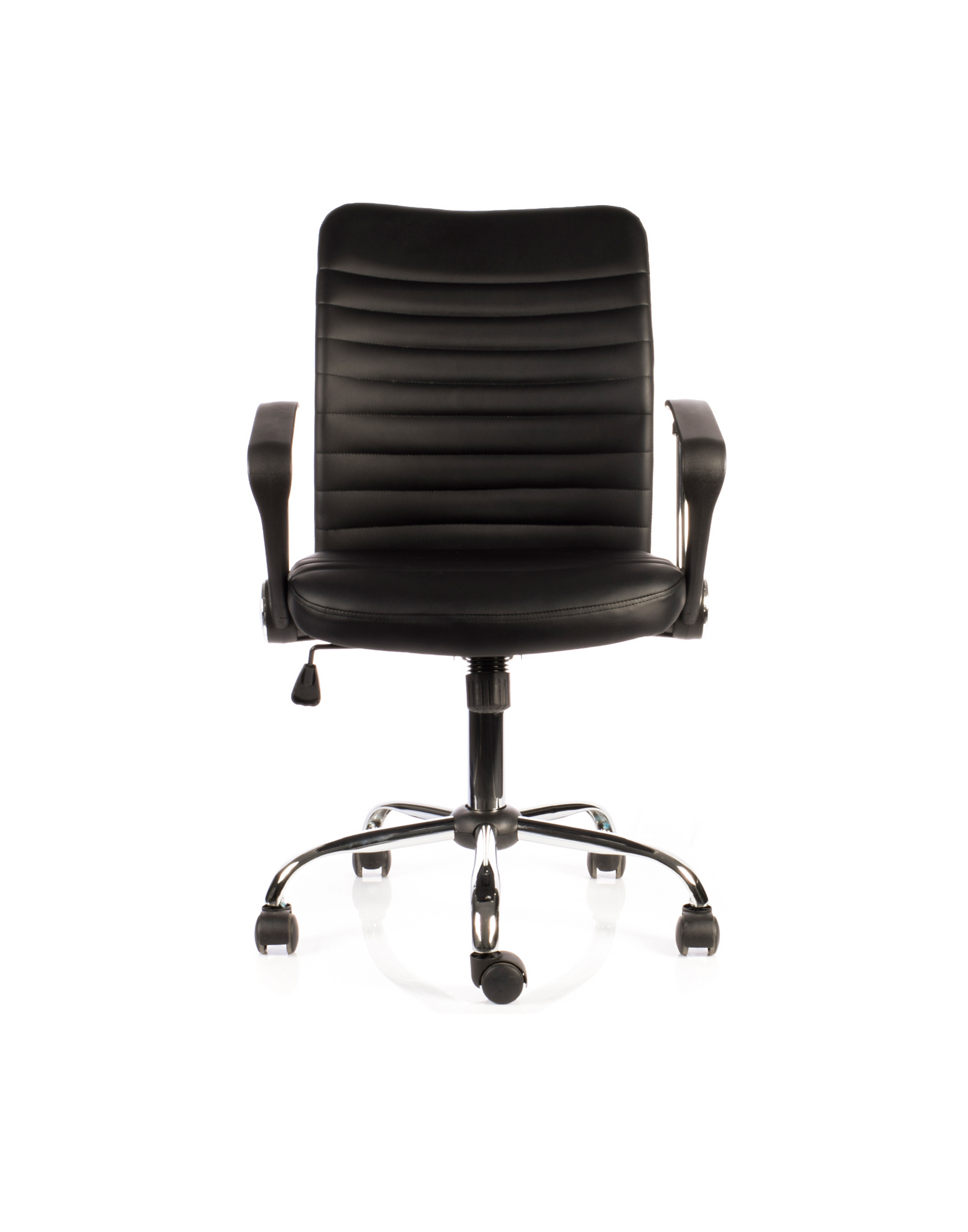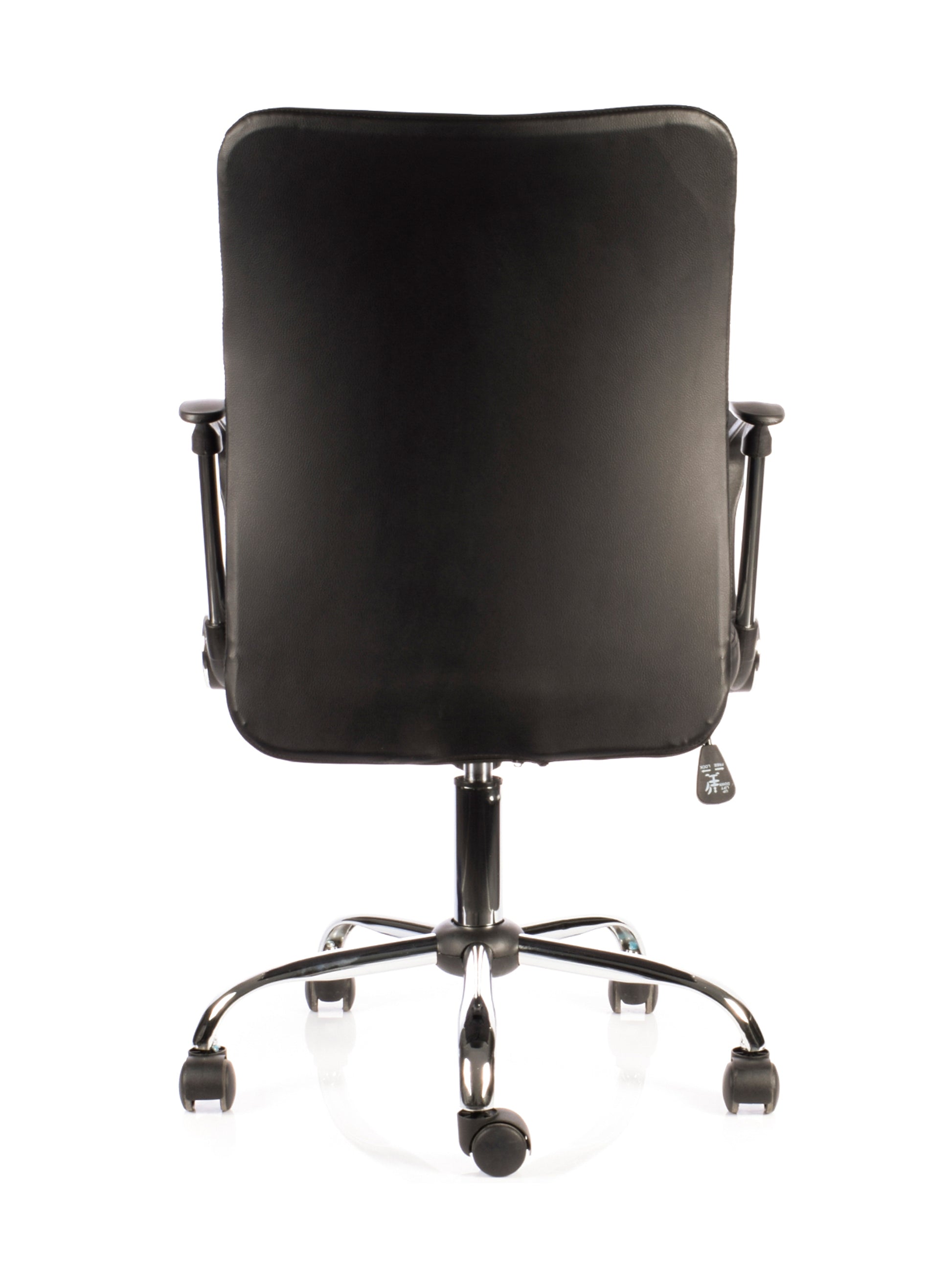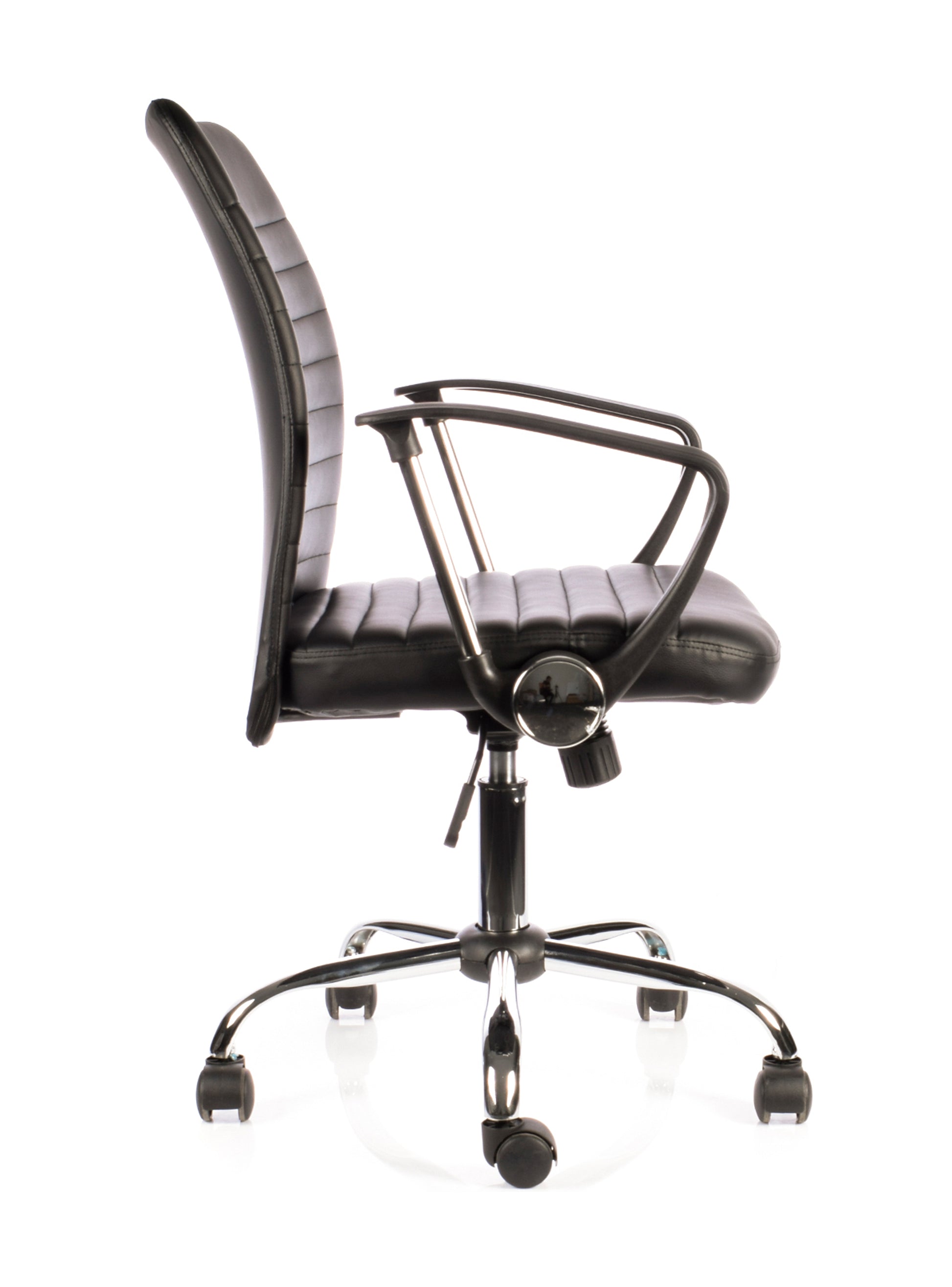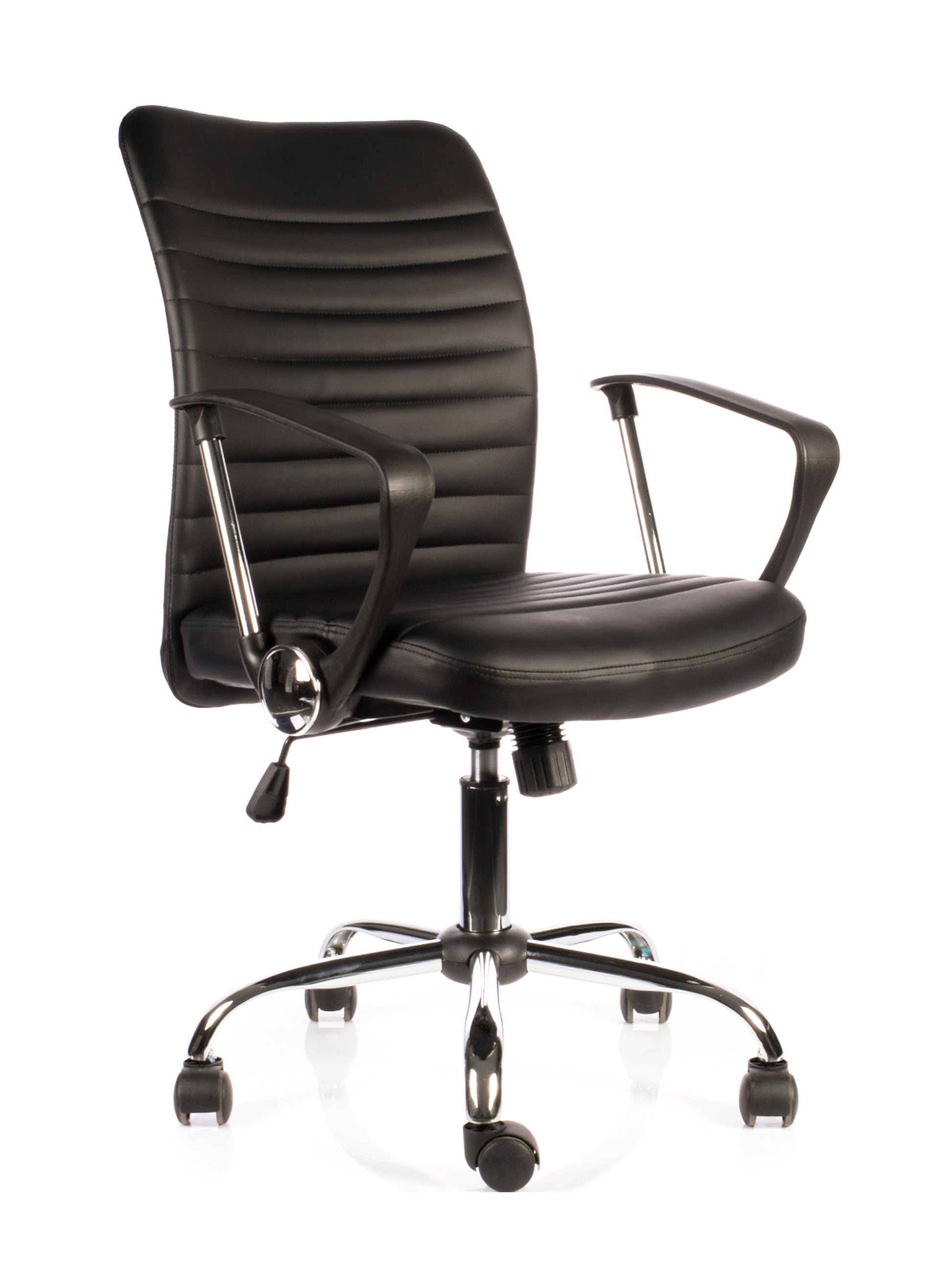 Sillón Clark de diseño moderno, es ideal para espacios de trabajo tanto de oficinas como Home Office. Posee un respaldo y asiento tapizado en cuero sintético negro, brazos fijos cromados con cubierta de polipropileno, regulación de altura del asiento, reclinación y regulación de tensión del respaldo con base giratoria cromada