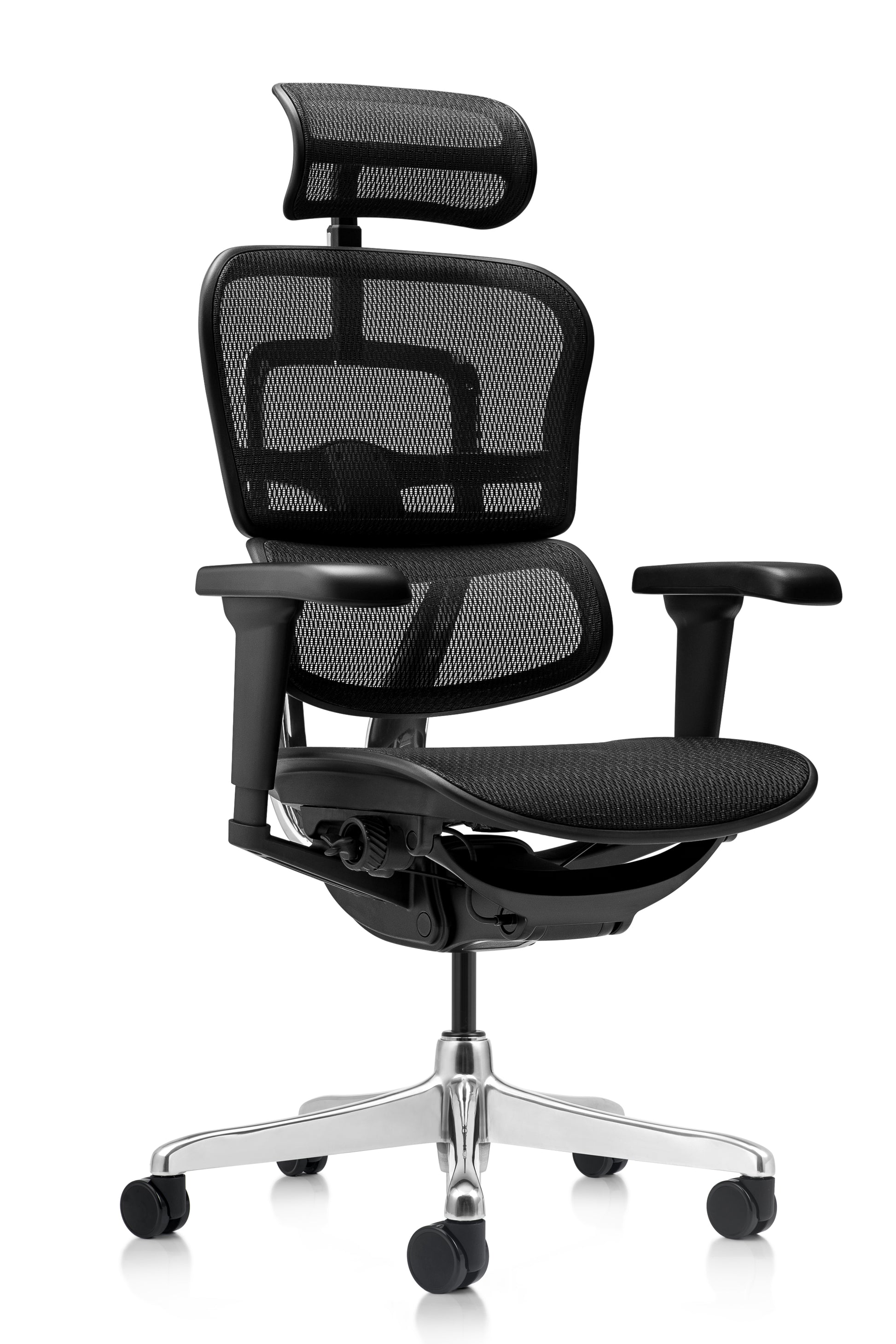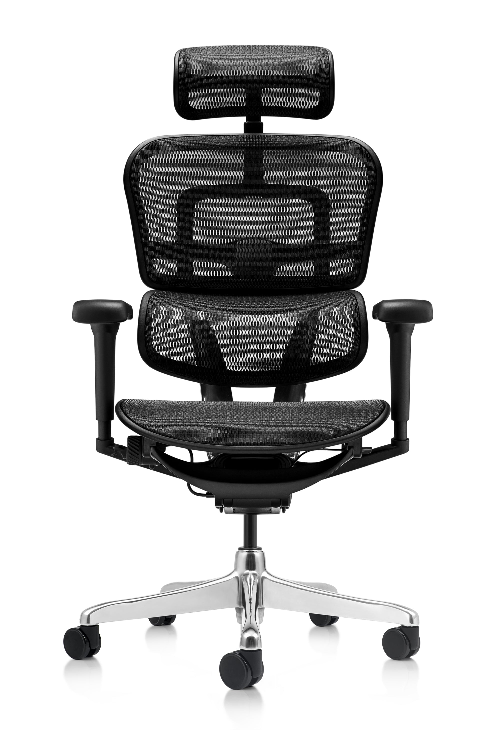 Respaldo en malla, Respaldo regulable en altura, Apoyo lumbar flexible, Asiento tapizado en cuero, Profundidad de asiento ajustable, Mecanismo sincrónico multibloqueo, Brazos con tres direcciones de movimiento, Base de aluminio pulido, Ruedas de 600mm, Estructura del respaldo en aluminio pulido.